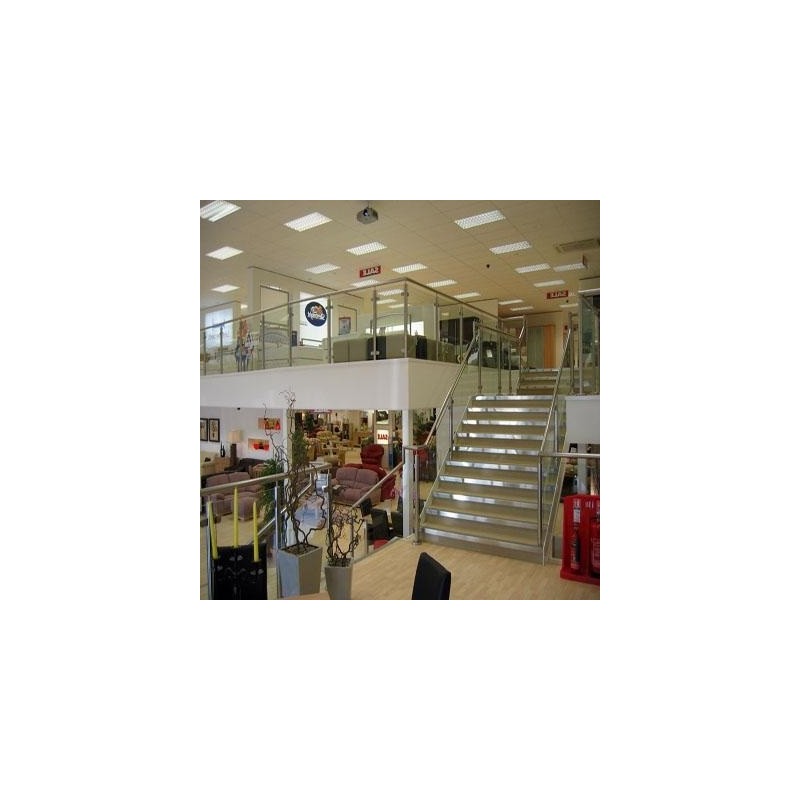 Plancher aggloméré 30 ou 38 mm (option sous-face blanche) ; caillebotis ou bacs acier. Garde-corps ERP correspondant aux normes NF P 01-012, NF P 06-001.