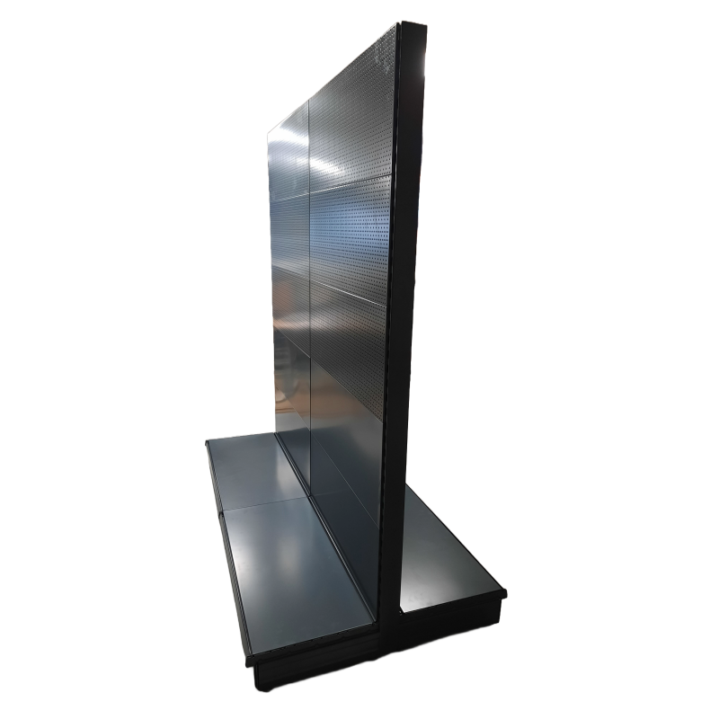 Ces supports de gondole permettent d'agencer les gondoles, en double-face, comme vous le souhaitez : complétez-les avec des fonds lisses et/ou perforés et des tablettes de différentes profondeurs. Comprend les montants et les pieds avec porte-tablettes amovibles.