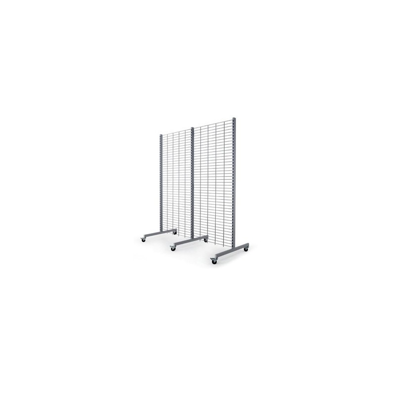 Sur base de montants de gondole Rayonor, le présentoir est équipé de 4 roulettes pivotantes à freins, tient une charge de 500kg. Le grillage en fil de 4mm soudé soutient une charge à l'arrachement de 15kg par accessoire supporté.